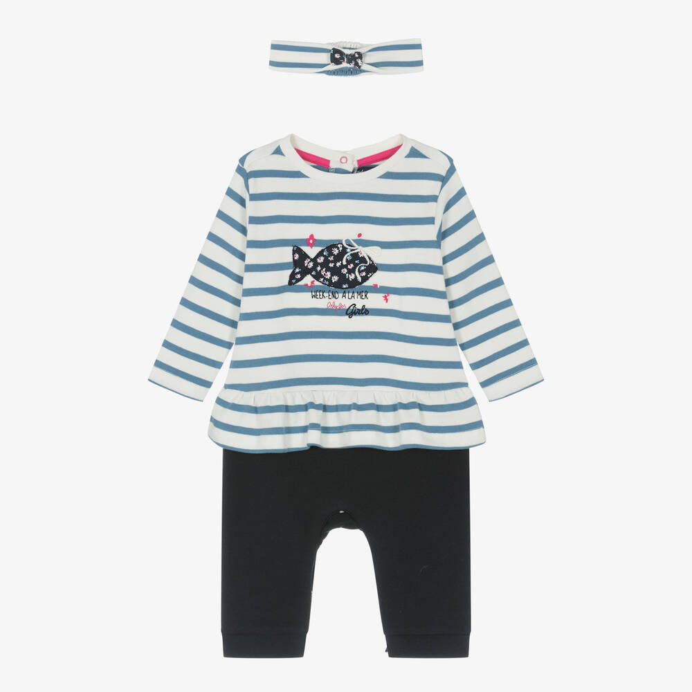 Cute cotton babygrow set for girls by French brand Week-end à la Mer, with the look of a two piece. Made in soft, comfortable jersey, the top part has the designer's signature Breton stripes in pale blue and ivory, with the fish logo appliquéd on the front in floral navy blue. There is a pretty ruffle around the waist, a navy blue lower part and popper fastenings on the back and between the legs. It comes with a coordinating, striped jersey headband that has a fixed, navy blue floral bow on top and an elasticated section around the back for a good fit.