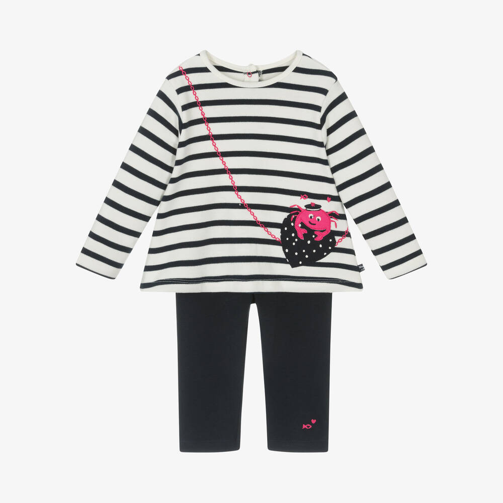 Navy blue and ivory cotton leggings set for little girls by French brand Week-end à la Mer, just right for relaxed, casual days. Made in soft, comfortable jersey, the top has the label's signature navy blue and ivory Breton stripes, with an appliqué heart and pink lobster shoulder bag. It fastens with poppers on the back. The full-length, navy blue leggings have a comfortable, elasticated waistband.