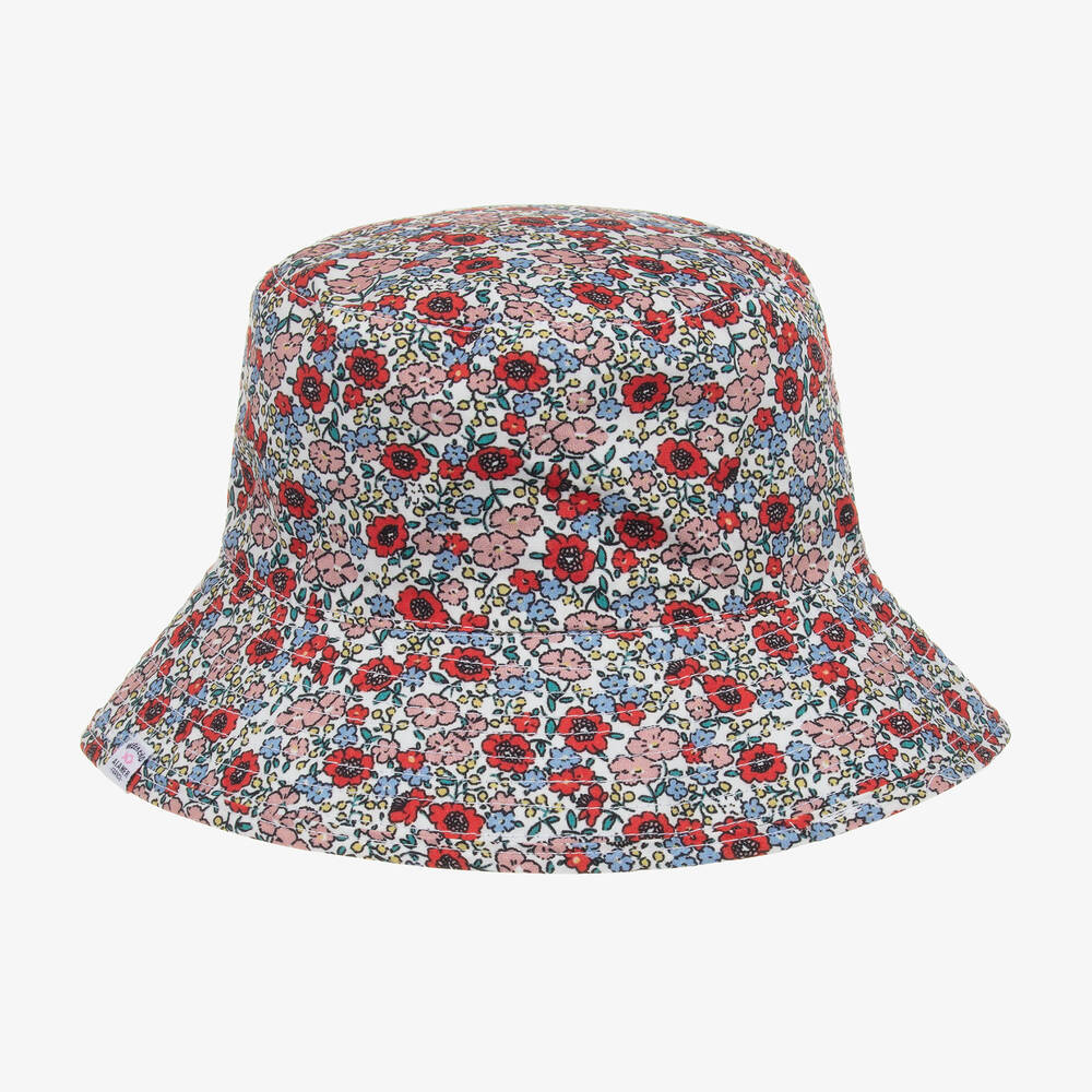 A sweet bucket-style sun hat for little girls by French brand Week-end à la mer, woven in lightweight cotton. Fully reversible, one side is plain blue chambray, whilst the other side has a pretty red and blue floral pattern. A small logo tab is stitched on the brim.