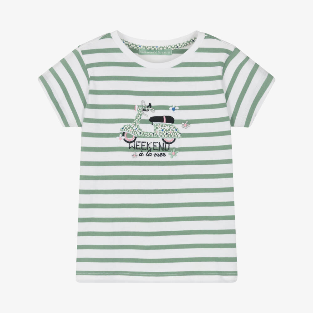 Green and white cotton T-shirt for girls by Week-end à la mer, designed with the brand's signature Breton stripes. Made in soft jersey, it has a classic motor scooter appliqué on the front with pretty flowers and an embroidered black logo.