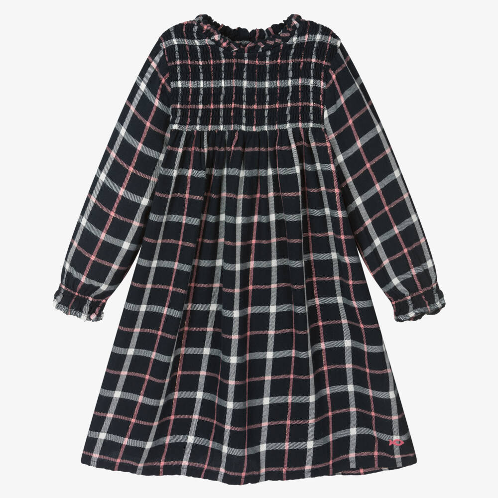 Lovely navy blue, pink and white checked dress for girls by Week-end à la mer, with glittery thread for a touch of sparkle. Beautifully soft, it is made in a viscose and cotton blend with ruching on the bodice and cuffs, and sweet ruffled trim. This classic style has a gathered skirt and button fastenings on the back, with the French brand's embroidered pink fish logo on the front hem for a subtle branded finish.