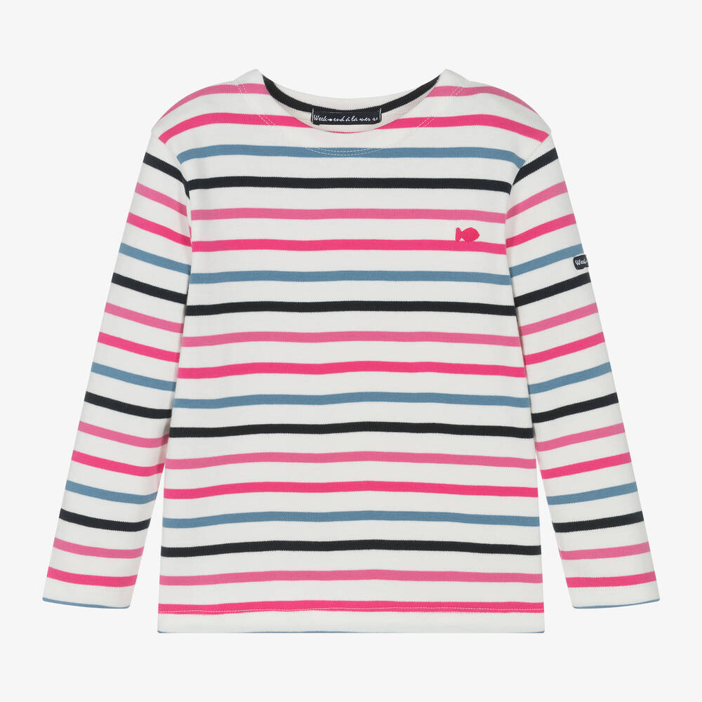 Casual cotton top for girls by French brand Week-end à la Mer, with the designer's signature stripes in shades of pink and blue on an ivory background. Made in soft, comfortable jersey, it has the label's fish logo embroidered on the front in pink and a navy blue logo tab sewn on one sleeve.