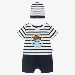 A lovely knitted hat and snood set for girls by Week-end à la mer, in ivory, pink and navy blue. Showcasing a delightful striped pattern, the hat features a playful pom-pom on the top. Both pieces are lined in super soft faux fur for cosy warmth and finished with an embroidered logo patch to complete the look.