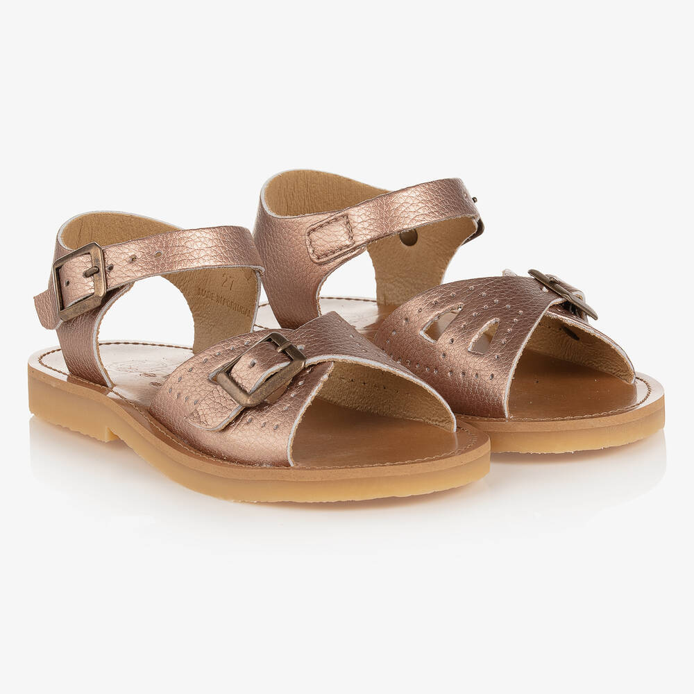 Girls metallic rose gold faux leather 'Pearl' sandals by Young Soles. These pretty sandals feature the brand's distinctive butterfly punch detailing, with buckle fastening straps across the foot and around the ankle. Lined with faux leather for comfort, they have a non-slip rubber outer sole for good grip underfoot.