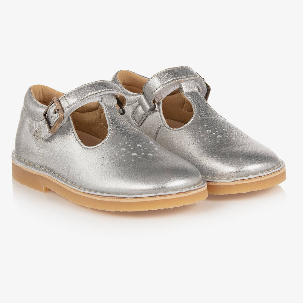 Girls metallic silver faux leather 'Penny' bar shoes by Young Soles. There is classic dot punch detailing on the top and a velcro strap with a decorative buckle. They are lined with faux leather for comfort, and have a non-slip outer sole.