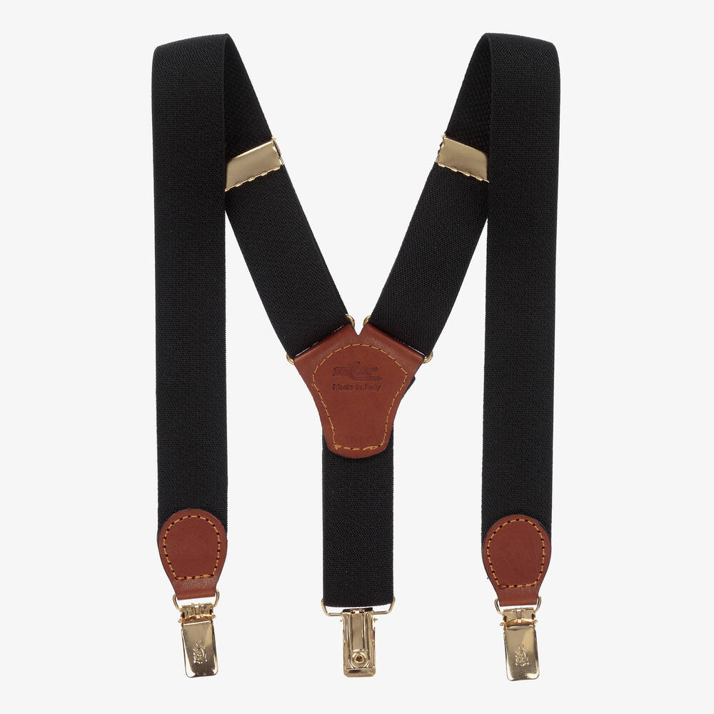 Handcrafted in Italy, these black braces for little boys and girls are by Zaccone. Made in soft, stretchy cotton, they have smart brown leather trims and a branded tag on one strap. They are fully adjustable and fasten with sturdy metal clips.