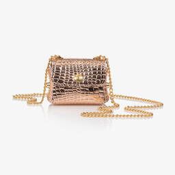 A metallic silver mini shoulder bag for girls by Italian brand Zaccone, made in faux leather. Adding statement to their outfit, this striking bag has a crocodile effect design with a gold chain strap. The main compartment is lined in leather and fastens neatly using a popper.