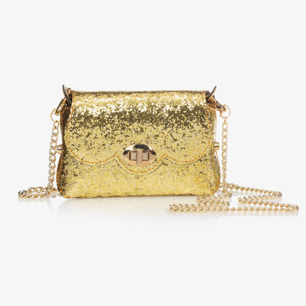 Girls shiny, glittery gold shoulder bag by Zaccone. It has one compartment with a smooth lining, a detachable gold metal chain strap and a golden twist lock fastening.