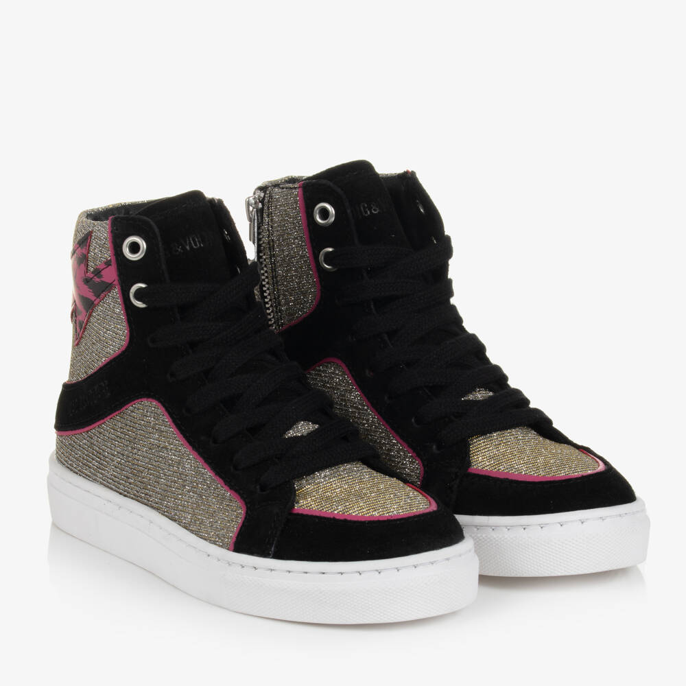 Inspired by the adult collection, these hi-top trainers for girls by Zadig&Voltaire are made from silver-gold textile with black suede detailing. Complete with both laces and practical side zip fastenings, they are lined in faux leather and have a white non-slip rubber outsole. The brand's logo is subtly embossed on the tongue and the side, and there is a branded leopard print lightning bolt across the heel.