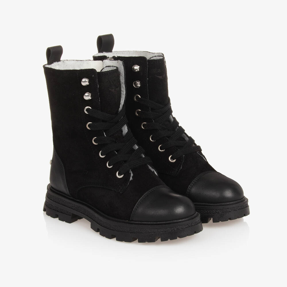 Inspired by the adult collection, these stylish black ankle boots for girls are by French brand Zadig&Voltaire. They are made in soft suede with smooth leather trims, and fasten with laces and a side zip. These cool boots have the designer's signature winged motif on the back of the heel, with an embossed logo on the tongue. They are lined in soft fleece for cosy comfort and have chunky rubber soles for a biker-style look.