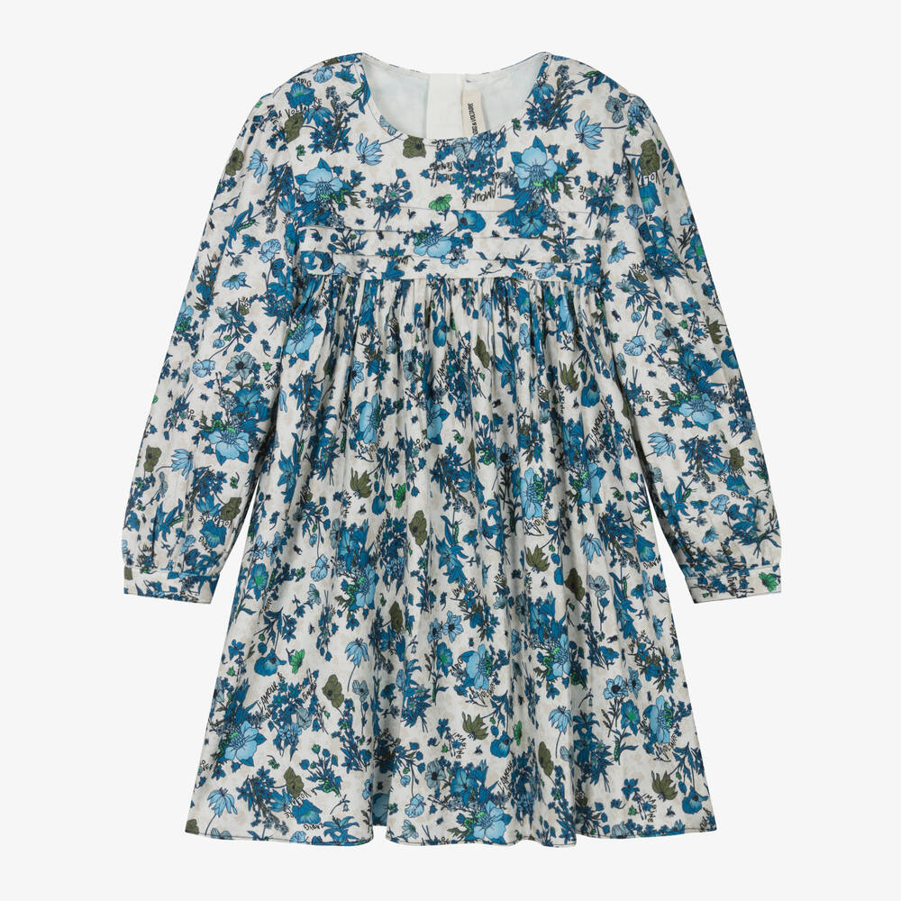 A lovely ivory, blue and green floral print dress for girls by French brand Zadig&Voltaire, inspired by the adult collection. It is made in soft and flowy viscose twill with pleated detailing on the bodice and gently puffed long sleeves. The pattern includes little slogans, infusing positive vibes into the design. It fastens with a concealed zip on the back and buttons on the cuffs.