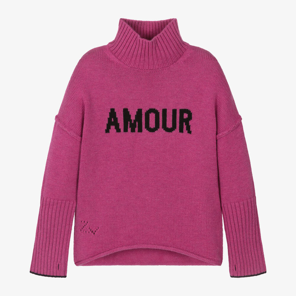 Magenta pink Mini-me sweater for girls by luxury brand Zadig&Voltaire, inspired by the adult collection. Knitted in a soft wool blend, this contemporary layering piece features an intarsia black 'AMOUR' script on the front and has matching black piping on the deep, ribbed cuffs. The label's iconic initials can be seen in a pointelle design near the split hem.
