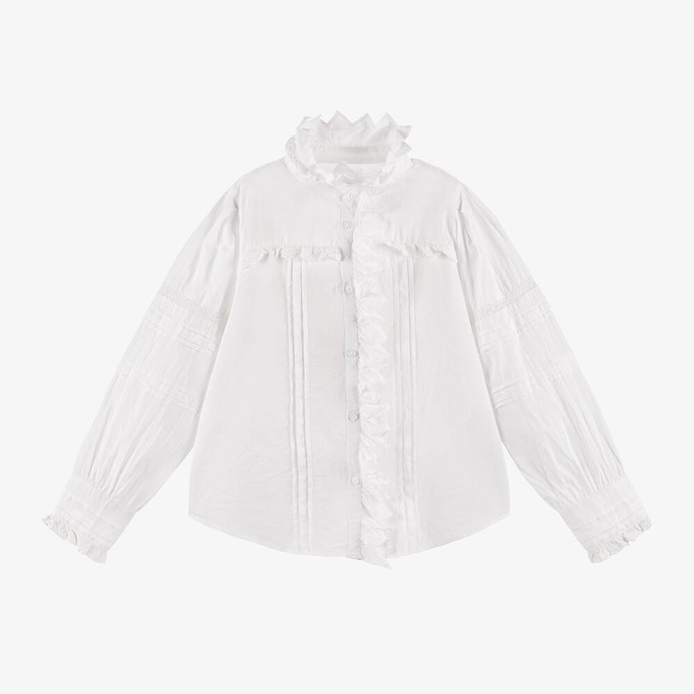 Beautiful white cotton blouse for girls by French designer Zadig&Voltaire, taking inspiration from the adult collection. Lightweight and semi-sheer, the stylish high-neck design features delicate crochet lace, zigzag edged ruffles and neat pintuck detailing. It buttons up on the front and cuffs.