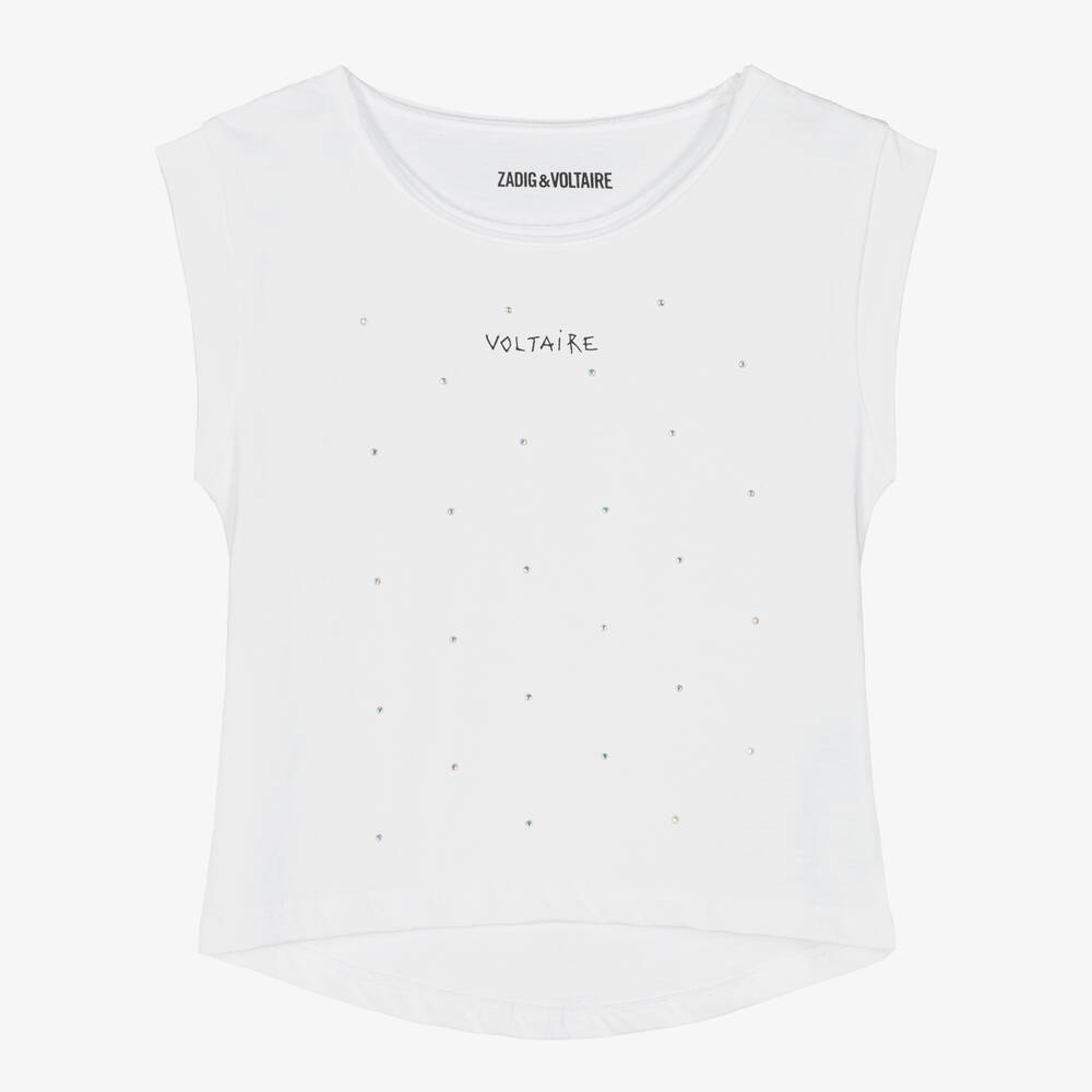 White T-shirt for girls by Zadig&Voltaire, made in soft cotton jersey. Inspired by the adult collection, this effortlessy casual top has ribbed cap sleeves and a black washed effect logo on the chest. It has a stylish dipped hem and the front is decorated with sparkly rhinestones for a cool, edgy look.