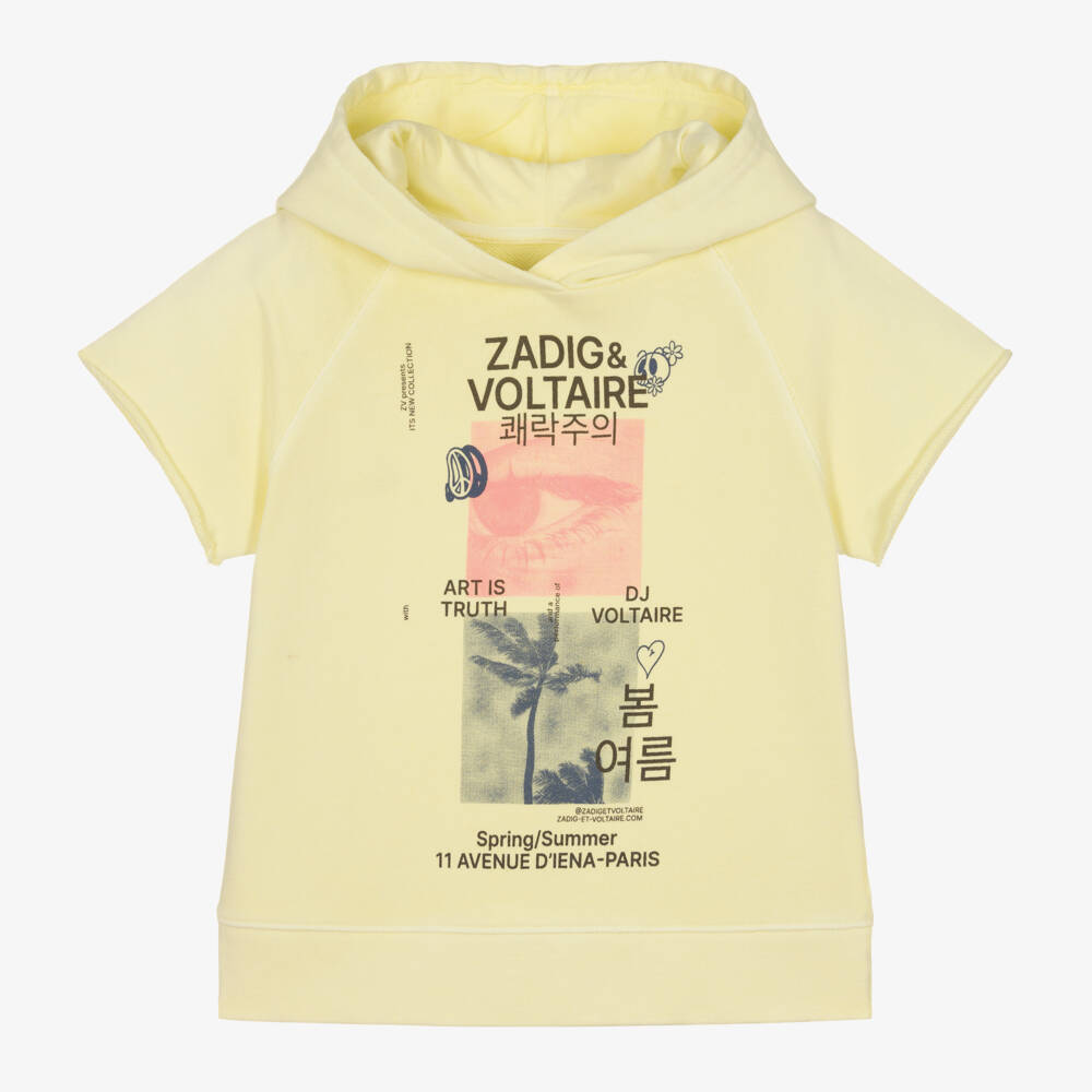Mini-me yellow short sleeved hoodie for girls by Zadig&Voltaire, made in soft mid-weight cotton jersey. In a summery pastel shade, this casual piece has a logo print on the front with a pink and navy blue graphic print below. It has a hooded neck and a gently ribbed hem, adding a sporty yet comfortable feel.
