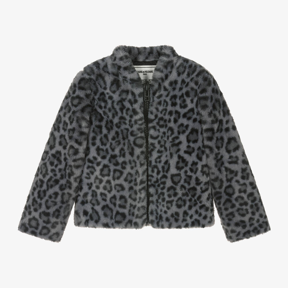 Stylish grey leopard print jacket for girls by Zadig&Voltaire, inspired by the adult collection. Beautifully soft and plush, this chic style has a cosy collar and hand-warming, concealed side pockets. The glossy black zip fastens the jacket easily, and it is lined in silky black fabric for comfort.