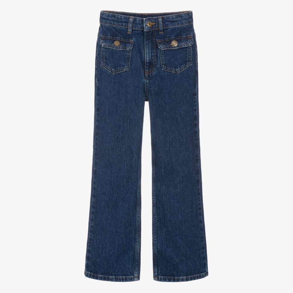 Blue, 70's style straight-leg jeans for teen girls by Zadig&Voltaire, inspired by the adult collection. Made in soft cotton denim, they have a stylish high waist, retro-style flap pockets on the front and two pockets on the back. The branded jeans buttons give them a classic look and there is a logo embossed brown patch on the back for a bold designer branding. They fasten with a button & zip on the front.