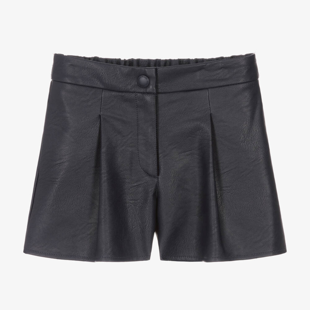 Rock the casual glam style in these navy blue faux leather shorts for teen girls by Zadig&Voltaire, inspired by the women's collection. Simply styled with soft pleats on the front, flared legs and concealed pockets on the side seams, they are sure to elevate any casual pieces. Made in coated viscose, they are slightly stretchy with a soft and comfortable interior and fastening with a logo popper and zip on the front.