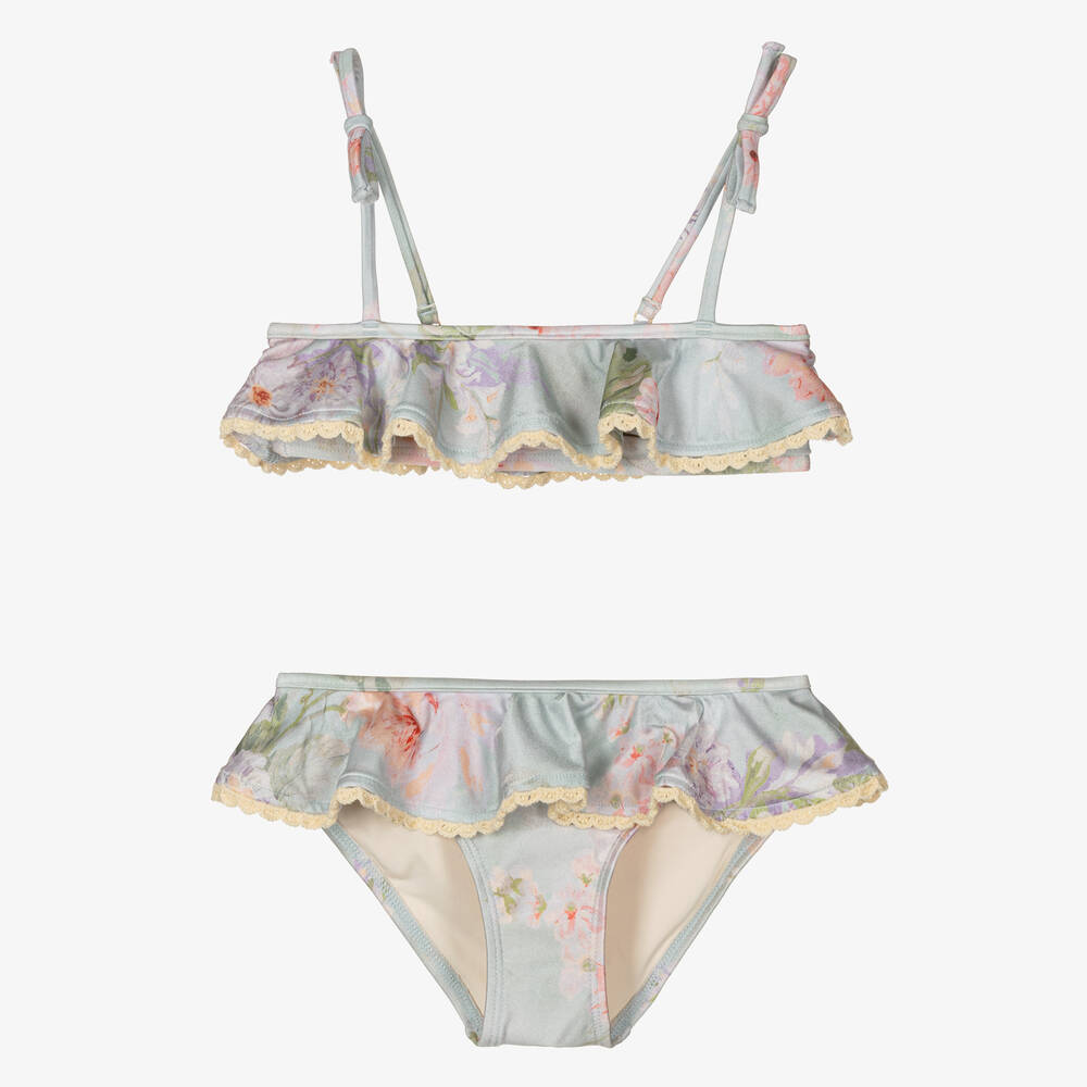 Lovely pastel blue bikini for girls by Zimmermann, the luxury resortwear designer. This pretty two-piece is trimmed with delicate ivory crochet scallops, statement ruffles and has a watercolour floral print. It is lined for comfort and modesty.