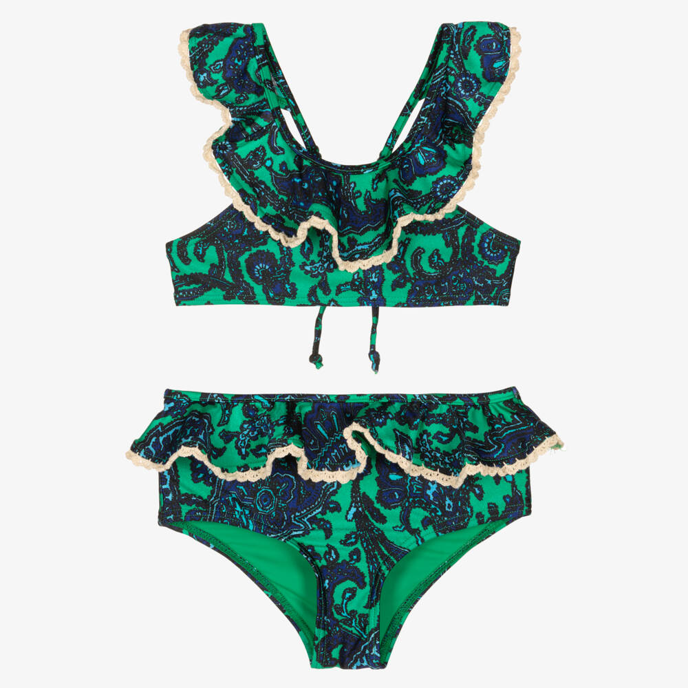 Pretty blue and green paisley print bikini for girls designed by luxury Australian brand Zimmermann. Fully lined, this silky and stretchy bikini has feminine ruffles with ivory crotchet trims. The top has cross-over adjustable shoulder straps for a comfortable fit, and the high-waisted bottoms complete the look.