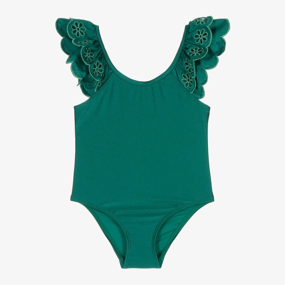 Girls Green Embroidered Floral Swimsuit