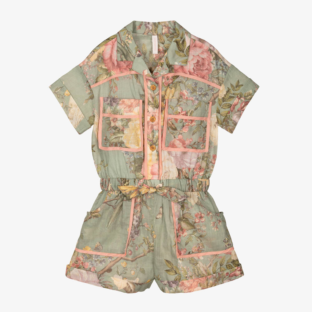 Gorgeous sage green playsuit for girls by luxury designer, Zimmermann. Ideal to wear at the beach, pool or resort or as a stylish outfit on a sunny day, this cotton style has a romantic pink floral print and slip pockets on the front. The elasticated waist creates a pretty shape, and it fastens with flower-shaped buttons on the front.