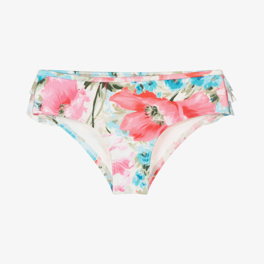 Lovely ivory bikini bottoms for girls by luxury Australian brand Zimmermann. Soft and stretchy, with a lightweight lining for comfort and modesty, they have a vibrant pink and blue floral pattern and a stylish ruffle trim on the back.