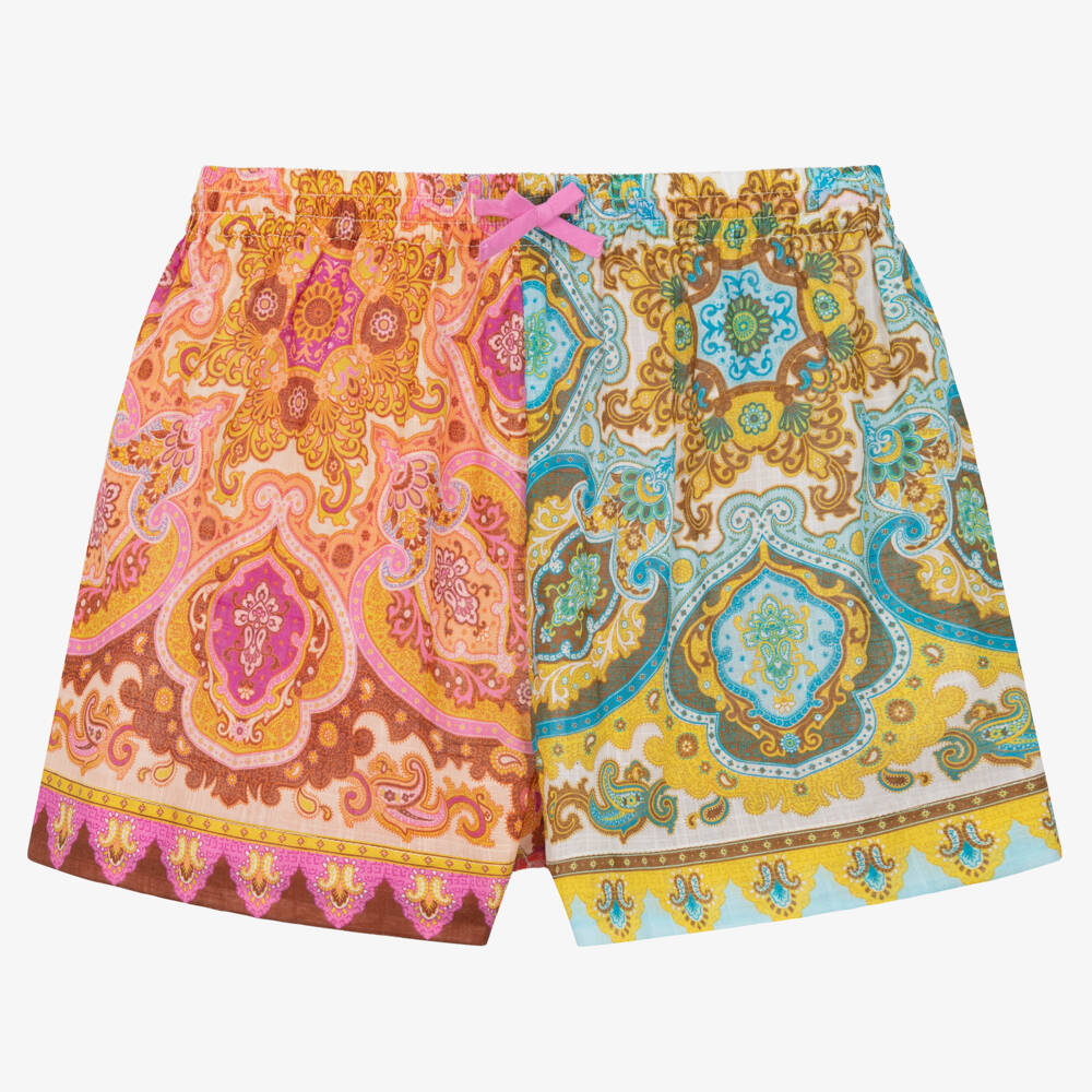 Pink, orange and blue patchwork shorts for girls from luxury brand Zimmermann. Soft, lightweight and breathable, these richly decorated shorts are panelled in paisley bandana prints for a cool effect. The elasticated waist is adjustable with pink drawstrings, allowing for the ideal fit.