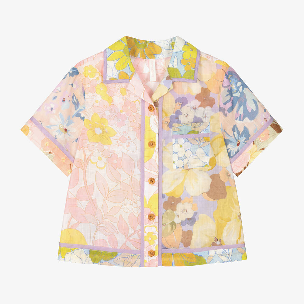 Multi-coloured shirt for girls by Australian brand Zimmermann, made in soft, lightweight cotton. Cool and comfortable, it has a colourful floral pattern in shades of pink, lilac purple and yellow. Semi-sheer with short sleeves and a revere collar, it is ideal for warm days. There is a patch pocket on the chest and it fastens with pretty flower-shaped buttons on the front.