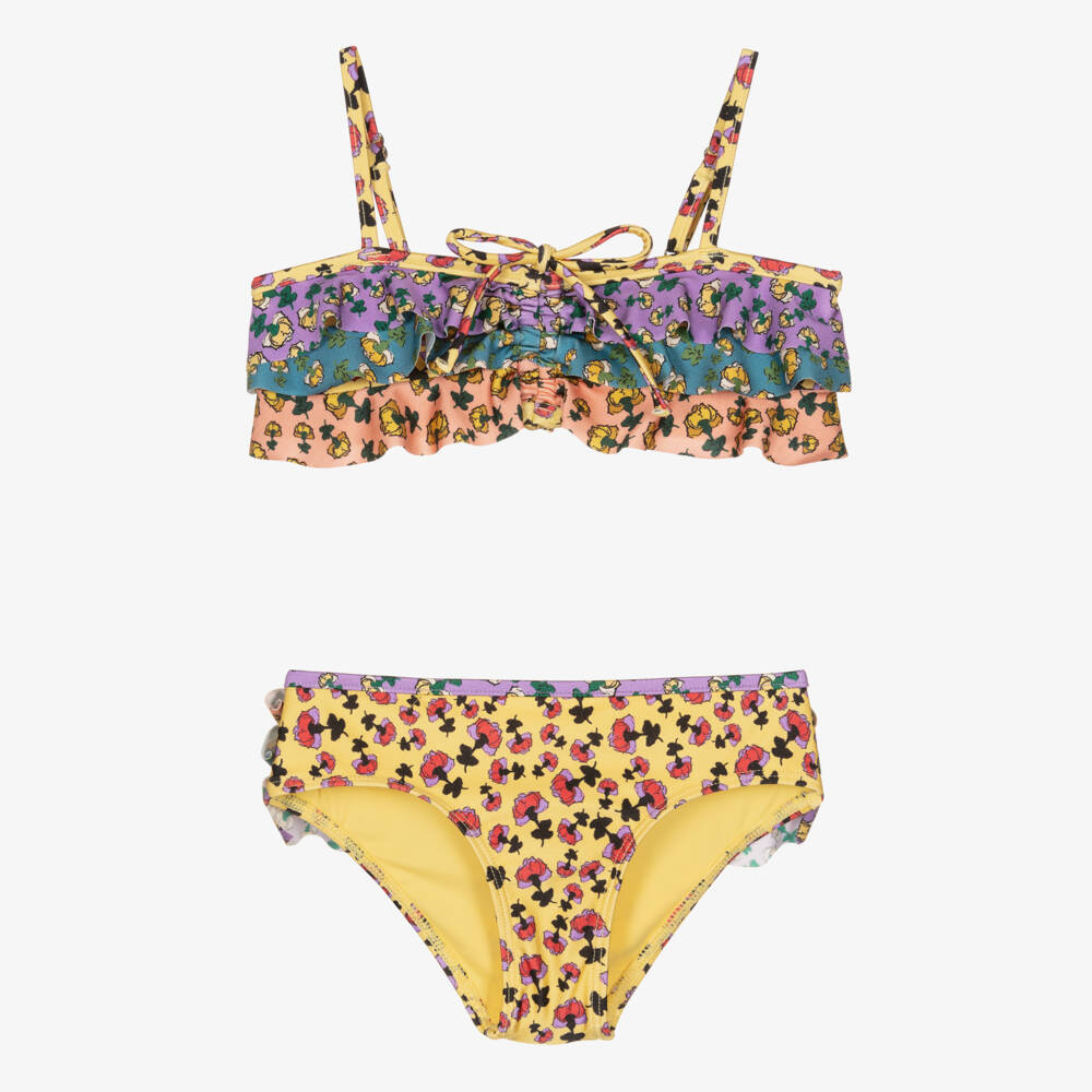 Gorgeous yellow and lilac purple bikini for girls, designed by Australian brand Zimmermann. Made in silky lined lycra, both the top and bottom have a ditsy floral print in contrasting colours. The bandeau-style top has a ruched trim with ruffles and adjustable straps, for an ideal fit. It comes with matching bottoms to complete the set.