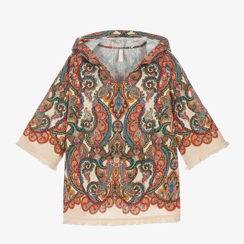 Stylish pale beige beach kaftan dress for girls by luxury brand Zimmermann, intricately patterned with red and blue paisley prints. It is made in soft and subtly slubbed cotton with a patch pocket on the front and three-quarter-length sleeves. This luxury resort wear is finished with delicate tassel trims, showcasing a stylishly bohemian vibe.