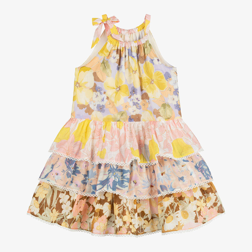 A stylish yellow floral dress for girls by luxury brand Zimmermann, made in beautifully lightweight cotton voile. Ideal for resort wear, this cool and comfortable design has contrasting floral patterned tiered layers, with a delicate ivory trim. It has an elasticated neckline with a fixed bow on one side and is lined for comfort and modesty.