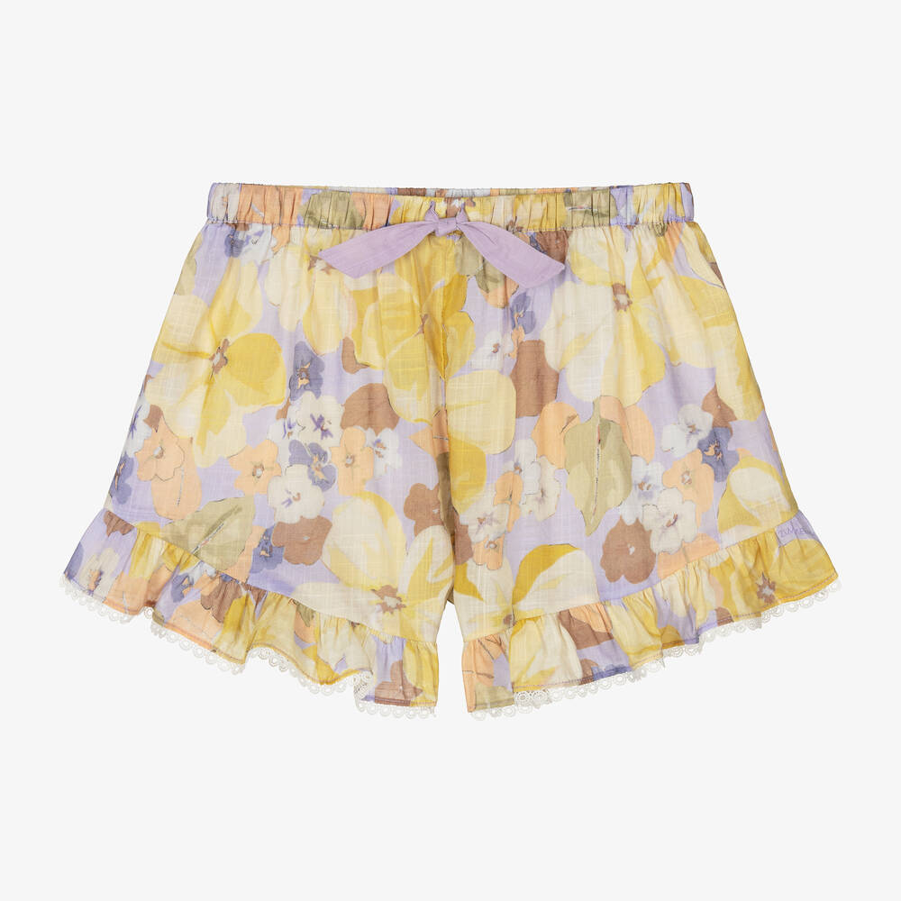 Lovely lilac purple shorts for girls by Australian brand Zimmermann, made in soft, semi-sheer cotton. Ideal for warmer days they are cool and lightweight and patterned with a colourful floral print in shades of yellow, purple and orange. There are ruffle trims on the legs, edged with pretty white loop lace and a comfortable elasticated waistband with a lilac purple bow trim on the front.