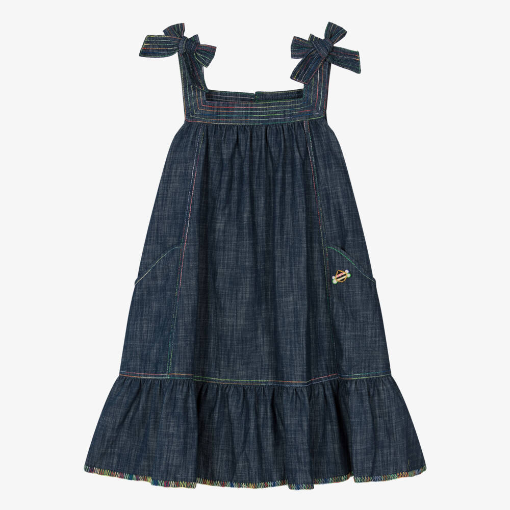 Casual blue denim dress for teen girls by luxury Australian designer Zimmermann, with a logo bee appliqué on one of the front patch pockets. Both laid-back and feminine, it has fixed bows on the shoulders, fun, colourful overstitch detailing and a ruffled hem finished with blanket stitch. The dress fastens with denim-covered buttons on the back.