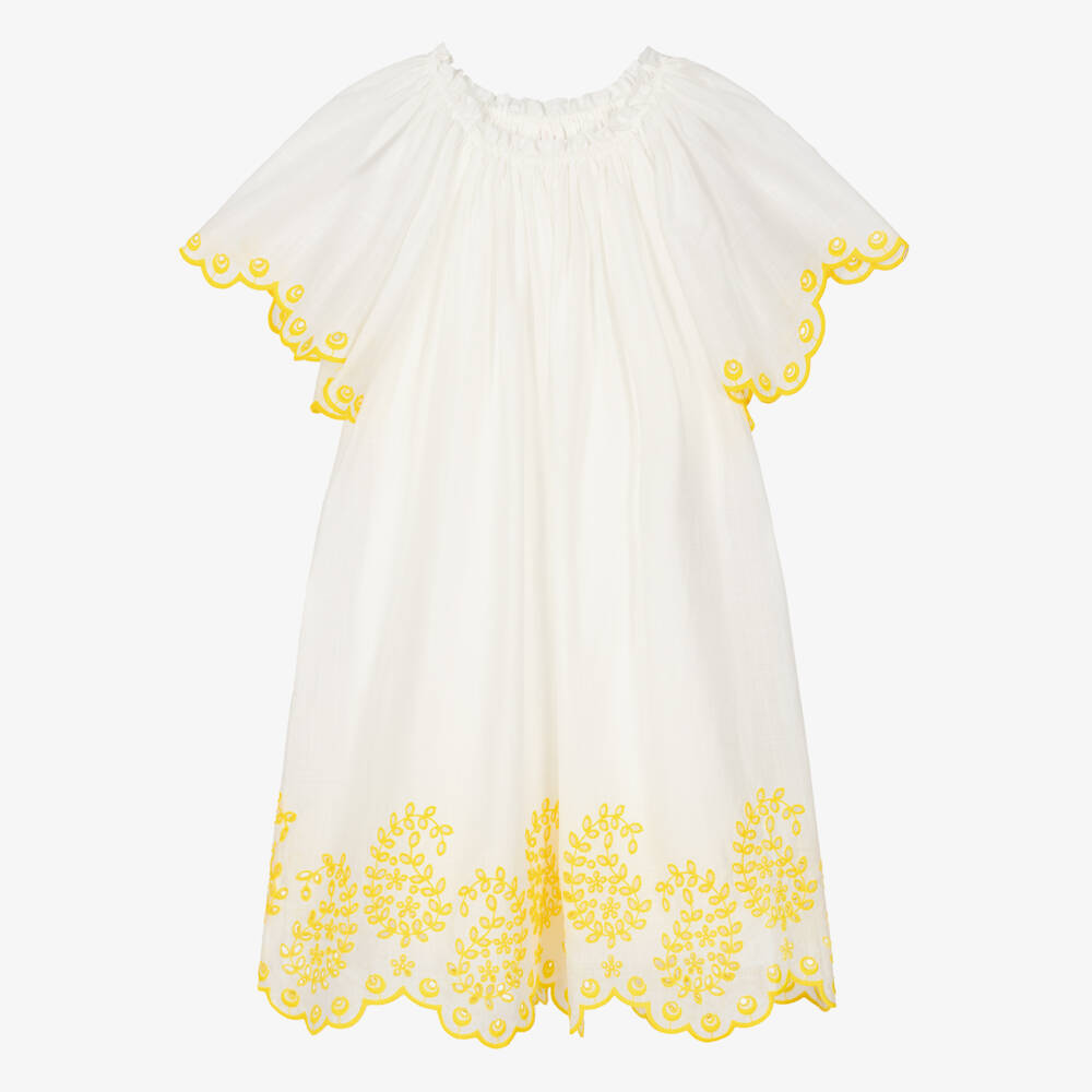 Simple and stylish for teen girls, this ivory cotton dress is from luxury resort wear brand Zimmermann. Made in sheer voile with a delicate weave, it has an elasticated neckline and voluminous flutter sleeves. Adding a standout finish to this easy-to-wear style, the cuffs and hem have beautiful yellow cut work embroidery with scalloped edging.