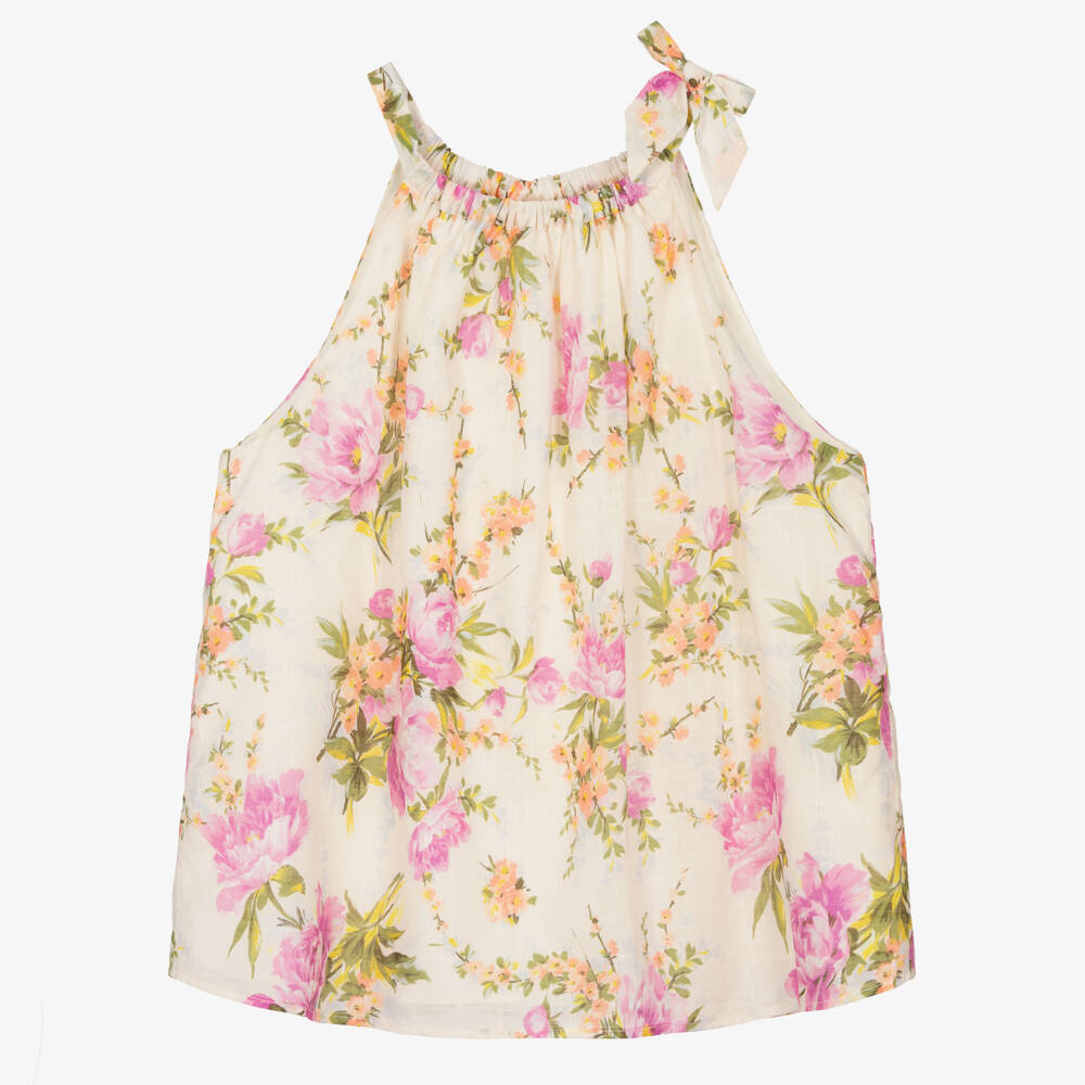 Ivory cotton halter neck top for teen girls by luxury designer Zimmermann, in a stylish flowy silhouette. This blouse has a pink and orange floral pattern, a ruched neckline and a bow on the shoulder for a charming, feminine look. It is finished with a lightweight lining.